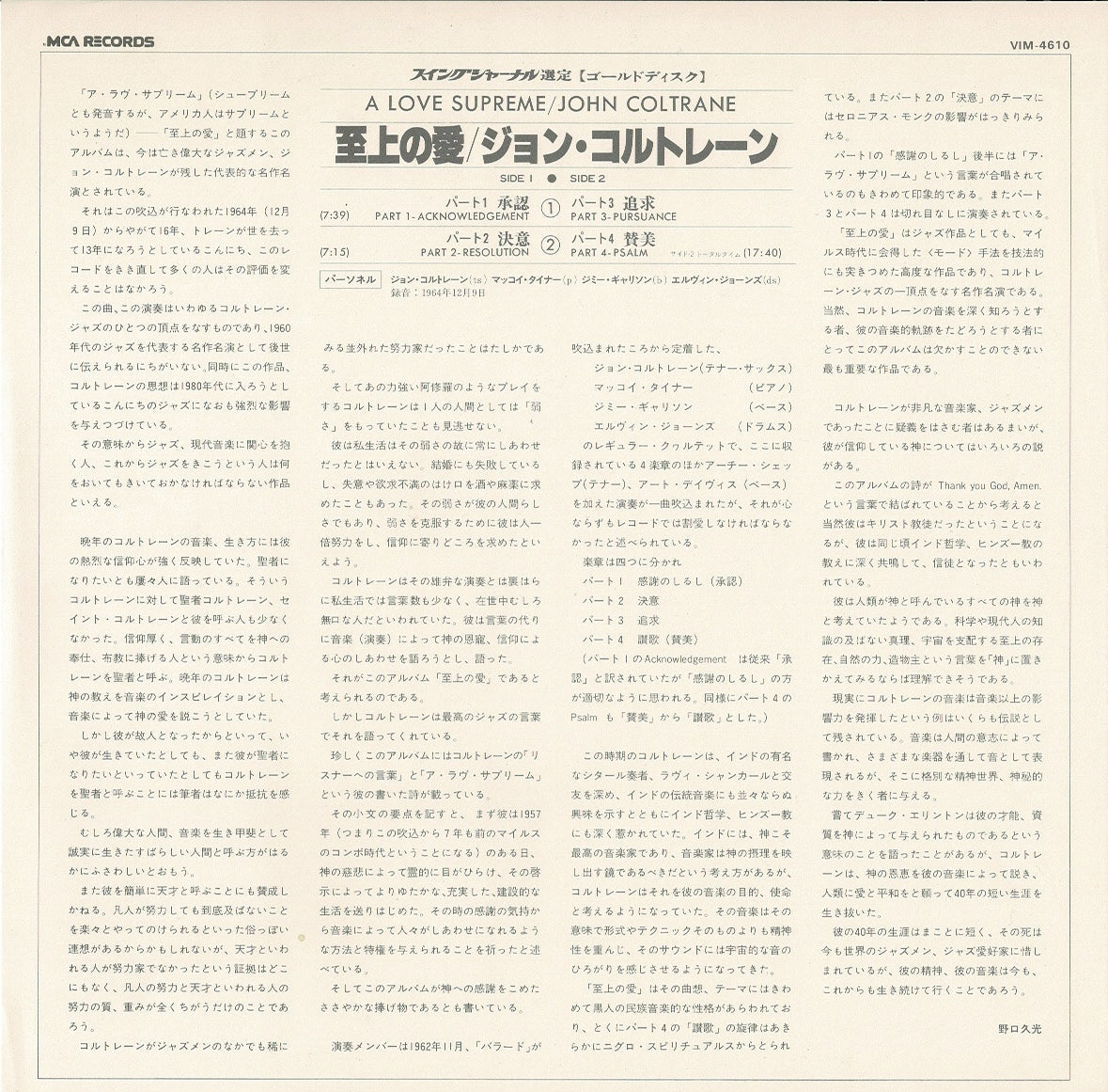 ●Cover Grading: EX- (帯とインサート付き。見開きジャケット。With OBI and insert. Gatefold cover.)